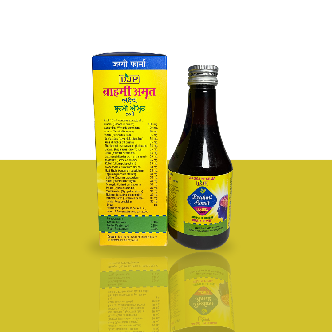 Brahmi Amrit Syrup by Jaggi Pharma is a complete Ayurvedic brain and memory tonic, carefully formulated with powerful herbs like Brahmi, Ashwagandha, Arjuna, Vidari, Amla, Shatavari, Usira, Utpala, Saunf, Shankhahuli, and Gulab. These herbs are known in Ayurveda for their ability to enhance mental clarity, focus, and overall cognitive health.