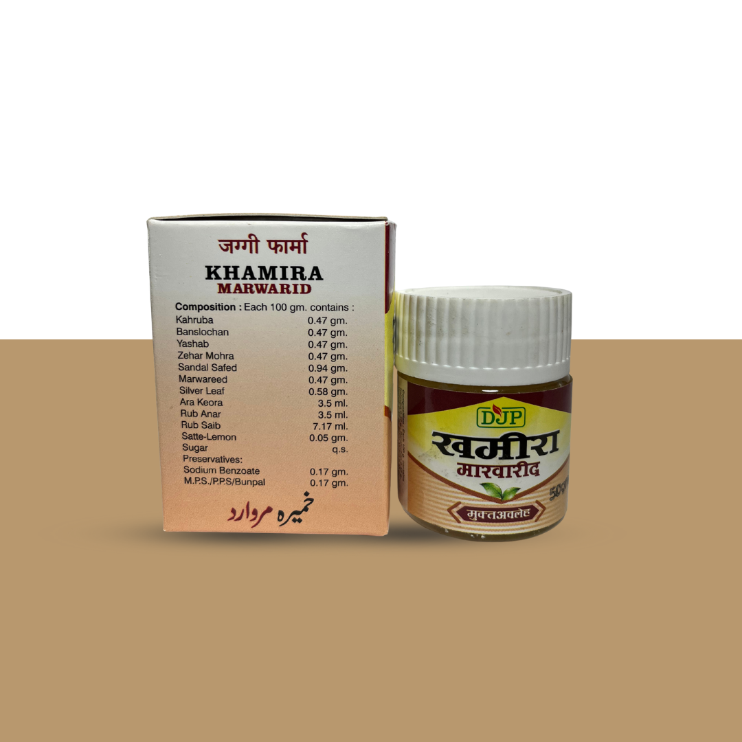 DJP Khamira Marwarid is a classical Unani herbal formulation designed to support the heart, brain, and nervous system. Enriched with precious ingredients like Marwareed (Pearl), Sandal Safed, Silver Leaf, Yashab, and herbal extracts, it acts as a natural tonic that provides strength, energy, and freshness to the body.