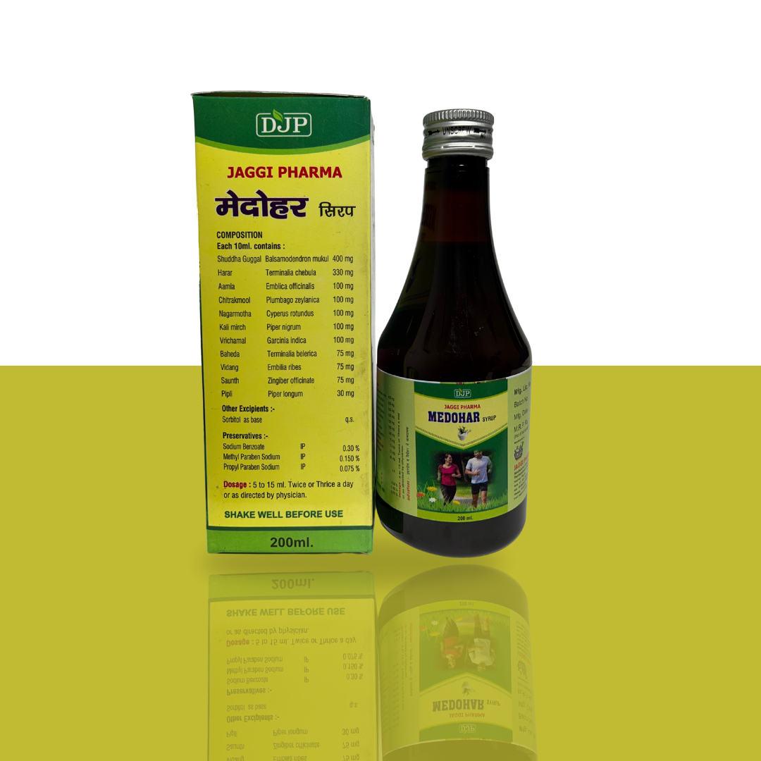 Jaggi Pharma Medohar Syrup is a traditional Ayurvedic remedy designed to support weight management, digestive health, and abdominal wellness (Udar Rog). Enriched with powerful herbs like Shuddha Guggul, Harar, Amla, Chitrakmool, Baheda, Saunth, and Pipli, this syrup helps in naturally reducing excess fat and improving metabolic balance.